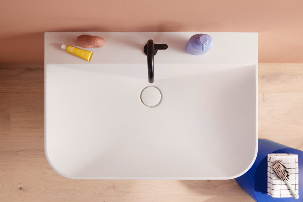 In erster Linie ist b:me aber durch den architektonischen Charakter und eine fast klassische Eleganz definiert. Schon der Waschtisch selbst kombiniert organische Formen mit geometrischer Klarheit. Die spitz auf den Ablauf zulaufenden Kanten bilden einen spannungsvollen Kontrast zur soft ausgeformten Beckenmulde. „Formal haben wir uns dem Mineralguss-Waschtisch über die Ästhetik eines nur partiell gefalteten Papiers genähert, dessen scharfe Kanten in weiche Rundungen übergehen“, verrät Designer Marcel Besau. „Die Form wird vor allem durch Licht und Schatten moduliert und verbindet die weichen und gewölbten Flächen von Sanddünen mit einer klaren Kantenführung.“